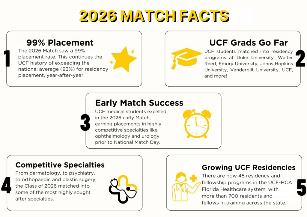 Home Admissions Match Data In This Section In This Section Prescription for Success Virtual Tour M.D. Admission Requirements Match Data Visit Us Why UCF? Viewbook Application Timeline M.D. Program Application Process M.D. Program Interview Process M.D. Accepted Applicants Technical Standards Admissions FAQ Contact M.D. Program Admissions Required Program Disclosures Class of 2026 Match Results Historical Match Results Class of 2025 Match Results Class of 2024 Match Results Class of 2023 Match Results Class of 2022 Match Results Class of 2021 Match Results