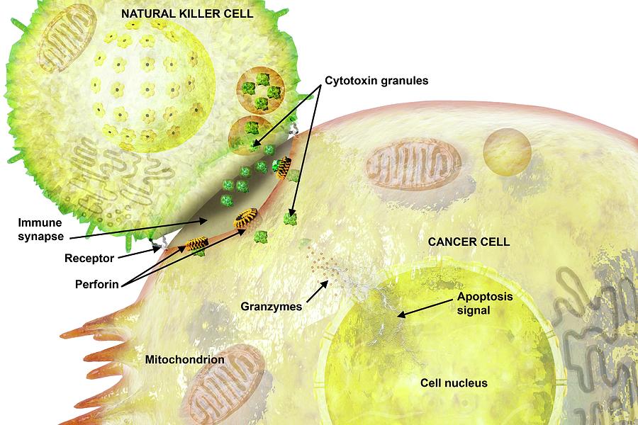 An NK cell targeting a cancer cell. Natural Killer cells are a type of white blood cell (lymphocyte) and play a key role in the immune system. Upon recognizing a target, the NK cell binds to the cancer cell and releases perforin proteins that create pores in the cell membrane. Through these pores, cytotoxic granules are delivered into the target cell, releasing granzymes that trigger programmed cell death (apoptosis).