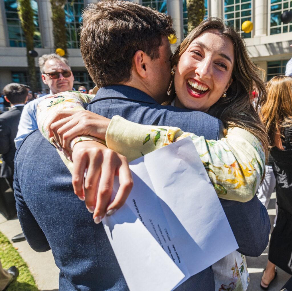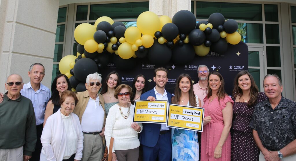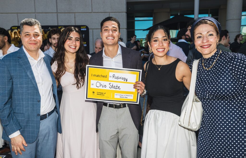 UCF medical student Taryn Posch chose family medicine as her specialty because she wants to take care of generations. And Friday’s Match Day was certainly a family affair. Posch and her fiancé, Kevin Beguiristain, both matched into residencies at University of Florida’s Shands Hospital as a dozen of their family members surrounded them and cheered.