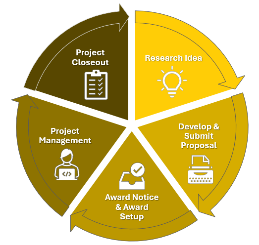 The COM Research Office supports faculty, staff, and students through the Research Project Lifecycle. The lifecycle includes the research idea, developing and submitting a proposal, receiving the notice of award and establishing the project internally, managing the project, and closing out the project when finished. Throughout each of these phases, research integrity and compliance are integral components.